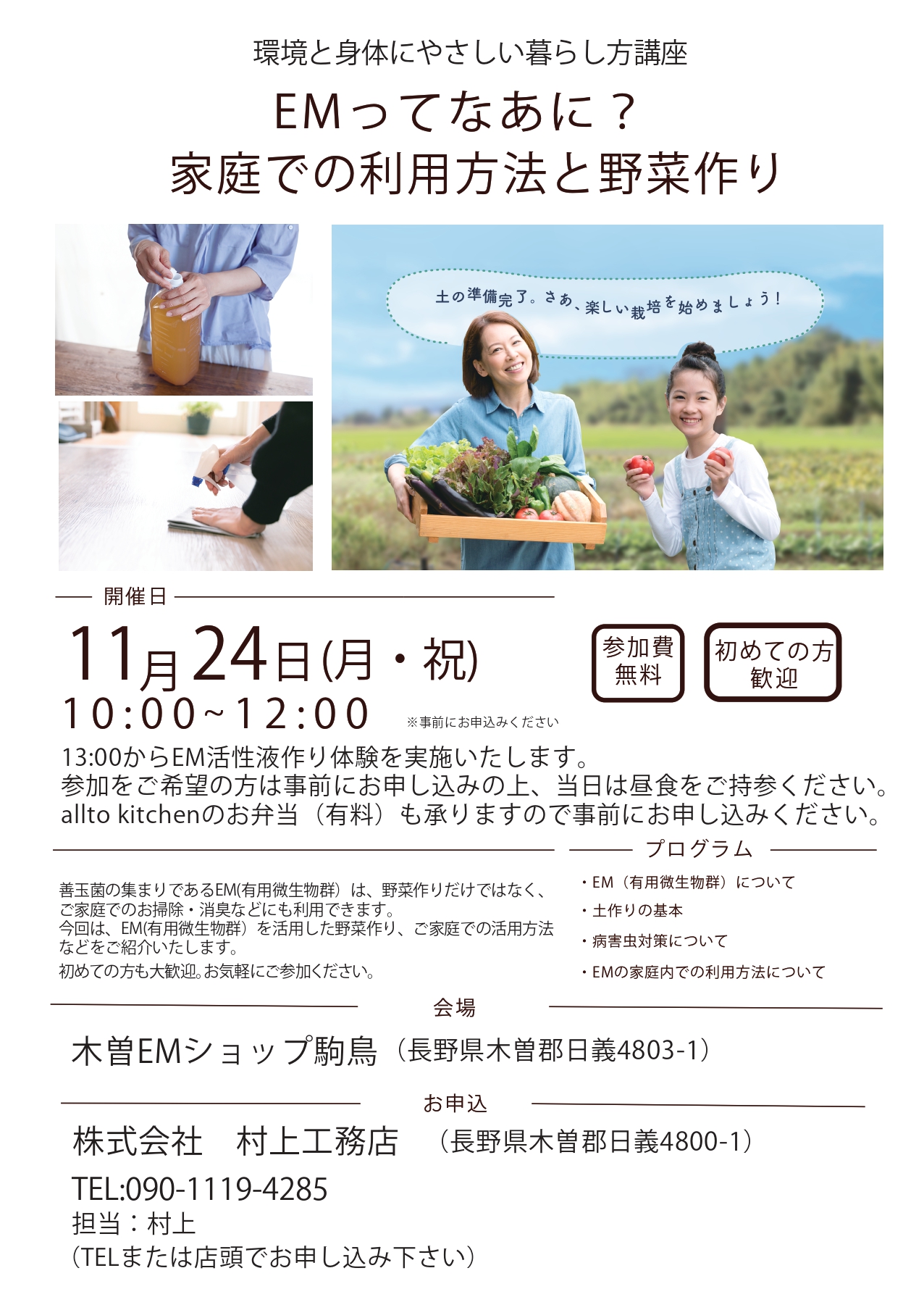 このイベントは終了しました環境と身体にやさしい暮らし方講座 EMってなあに? 家庭での利用方法と野菜作り長野県木曽EMショップ駒鳥