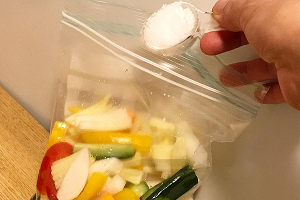 2 1をジップ付き保存袋に入れ、塩を加え軽く揉み、空気抜いてジップを閉じ、冷蔵庫で1時間程置く。