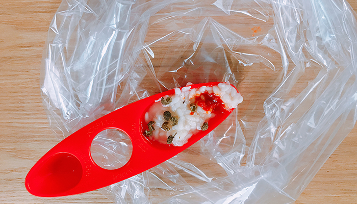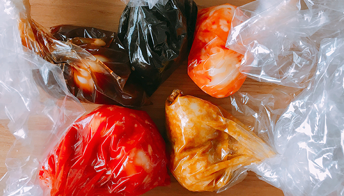 2 ナイロン袋の中に、塩麹とお好きな味付けの調味料を混ぜる。