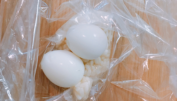うずらの卵を入れ、卵表面全体に調味液をまぶしたら、空気を抜き、袋の口を結ぶ。