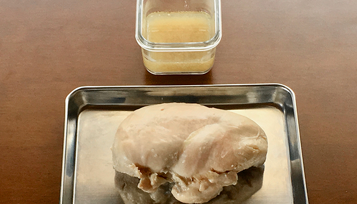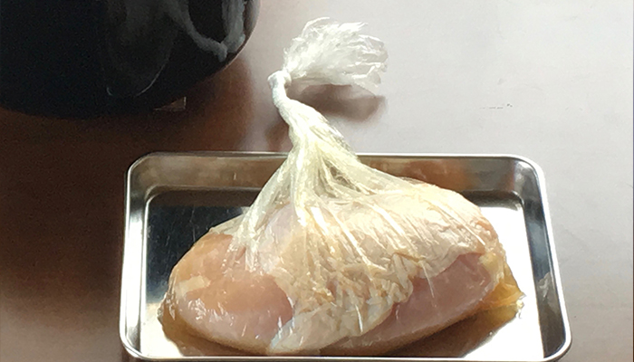 湯煎調理のコツは袋の空気をしっかり抜いて真空に近い状態を作ること。それにより熱伝導率が上がり、食材の中まで火が通ります。
