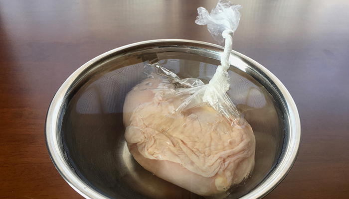 ポリ袋に鶏肉・塩麹・紹興酒を入れ、水を張ったボウルに袋ごと沈め、水圧で袋の中の空気を抜きます。袋の口をねじりながら先端を片結びして、冷蔵庫で一晩置きます。