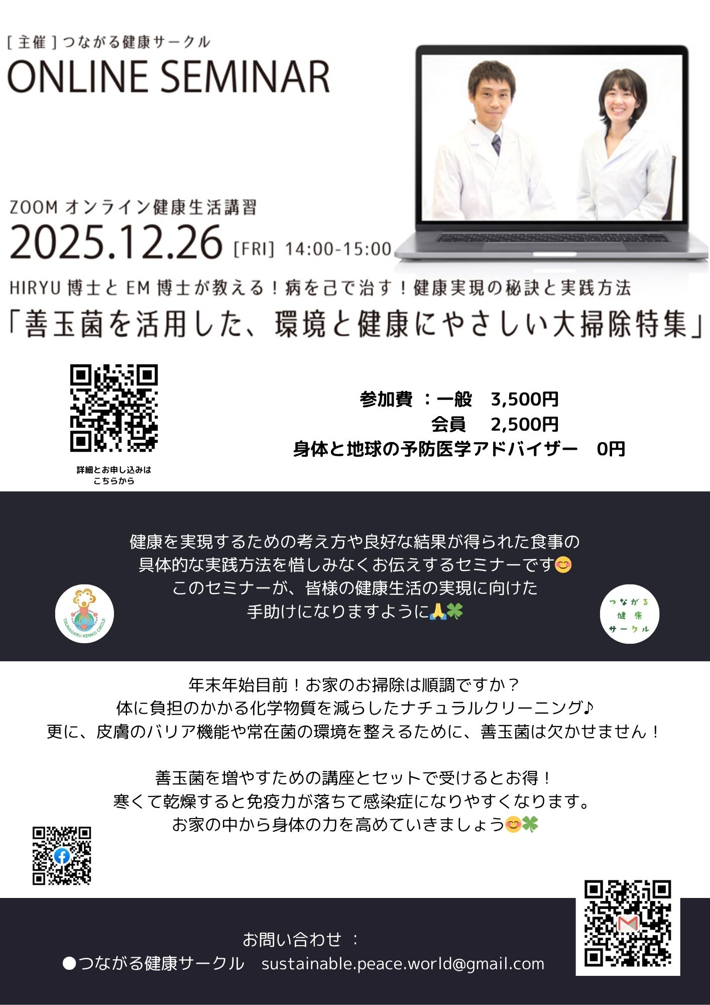 【オンライン】善玉菌を活用した、環境と健康にやさしい大掃除特集全国つながる健康サークル主催、学びの健康講演!!