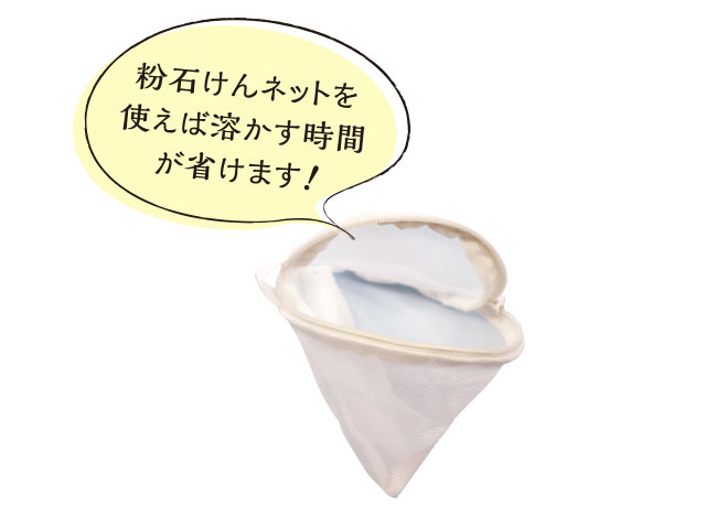 粉石けんは洗濯物を入れる前に洗濯槽でしっかり溶かそう!粉石けん用の洗濯ネットを使うと便利。洗濯の最初に酸素系漂白剤を水に入れると発泡するので、粉石けんの溶け残り予防に効果的。