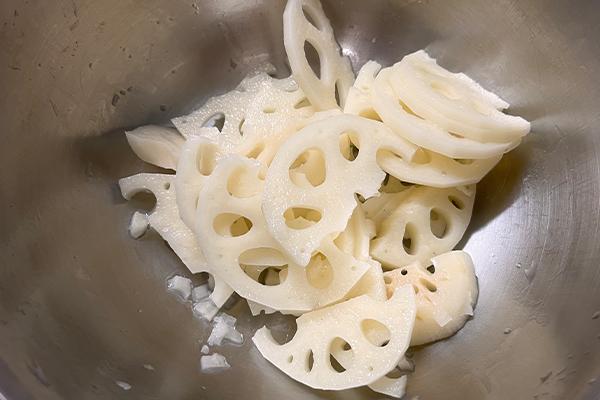 2 レンコンは皮を薄く剝き、3ミリ程度に切ってお酢と合える。