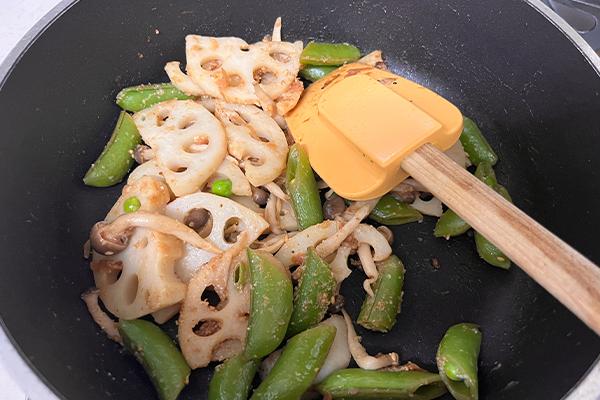 3 レンコン、しめじを炒め、ゆでたスナップエンドウを加え、梅味噌を合える。
