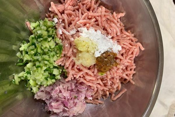1 焼売のタネを作ります。タネの材料をボールで混ぜます。