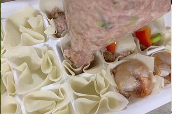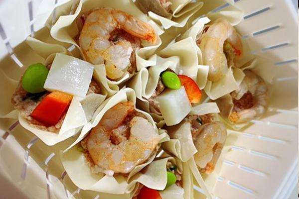 3 タネの上に飾り用のエビをのせて蒸し器で7分蒸して完成。