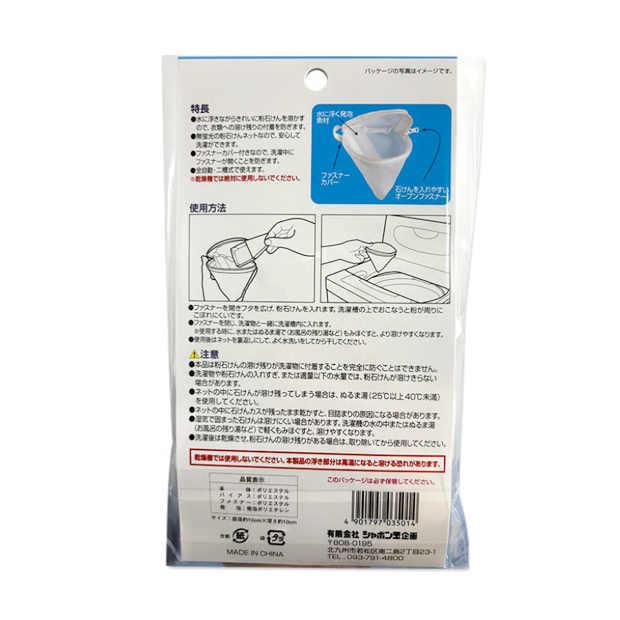 ※使用する時に、水またはぬるま湯で(お風呂の残り湯など)もみほぐすと、より溶けやすくなります。 - 使用後はネットを裏返しにして、よく水洗いしてから干してください。