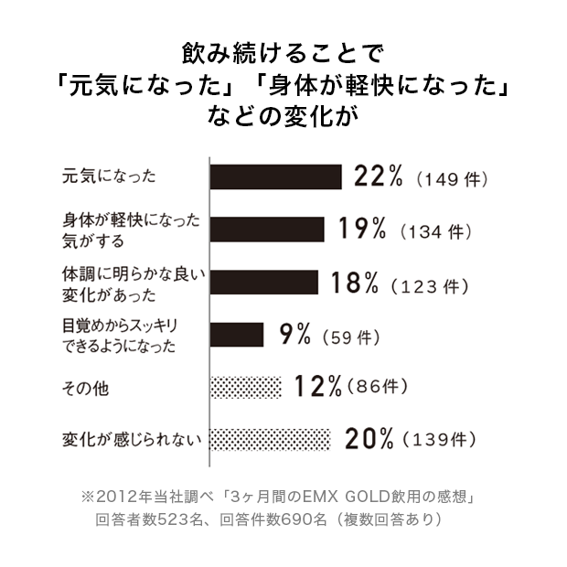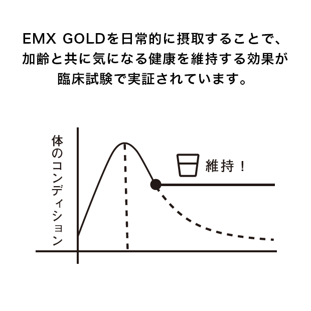 EMX GOLDは毎日継続して飲んでいただくことで良さを実感していただける健康サポート飲料です。「身体が軽快に感じる」「積極的に外出できるようになった」とお声をいただいております。 - いつ飲めばいいですか?