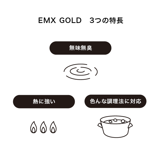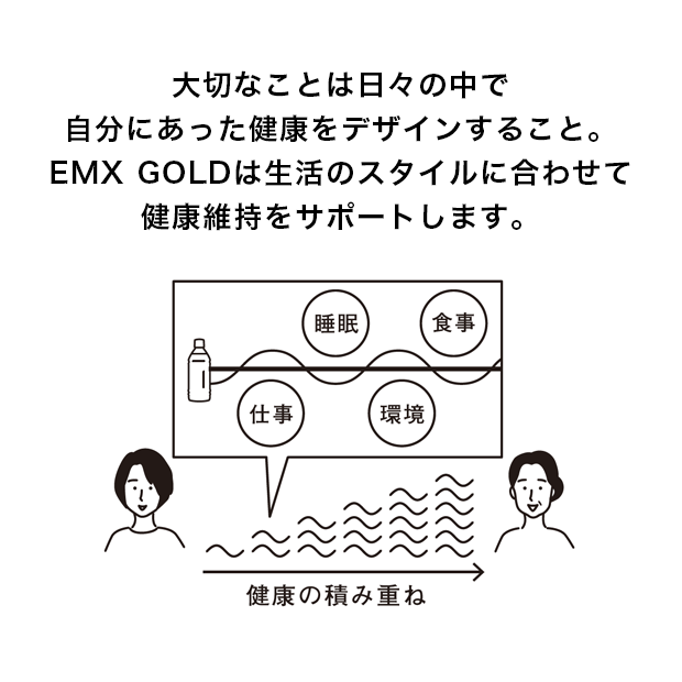 EMX GOLDは、毎日行う料理や水分補給の時にプラスするだけ。朝の飲み物に入れたり、調理の時に加えたりすることにより、さらに健康的な生活がデザインできます。